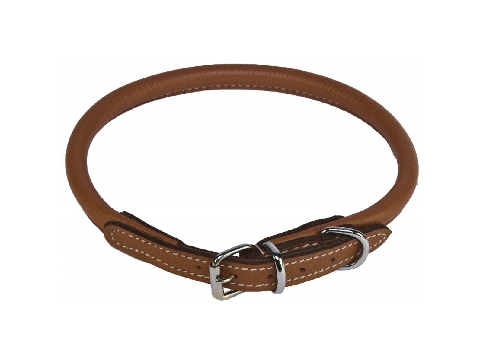 Kvalitets hundehalsbånd af særligt blødt, rundsyet okselæder med hvide stikninger. Læderet er blødt, så det er ekstra behageligt for hunden at have på.