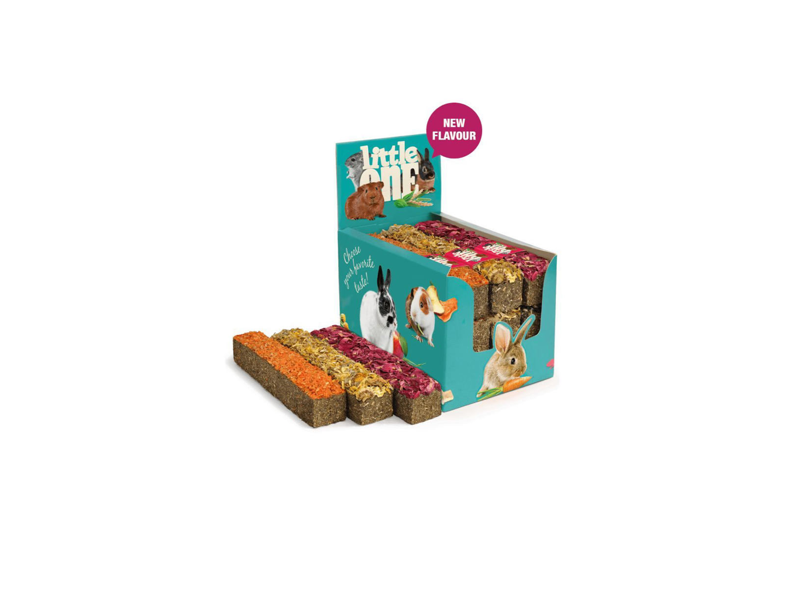 Little One Stick er et lækkert legetøj, som er udviklet specielt til gnavere og kaniner. Den er lavet af duftende enggræsser og dækket med en af de tre lækre toppings: morgenfrueblomster, gulerod eller rosenblade.