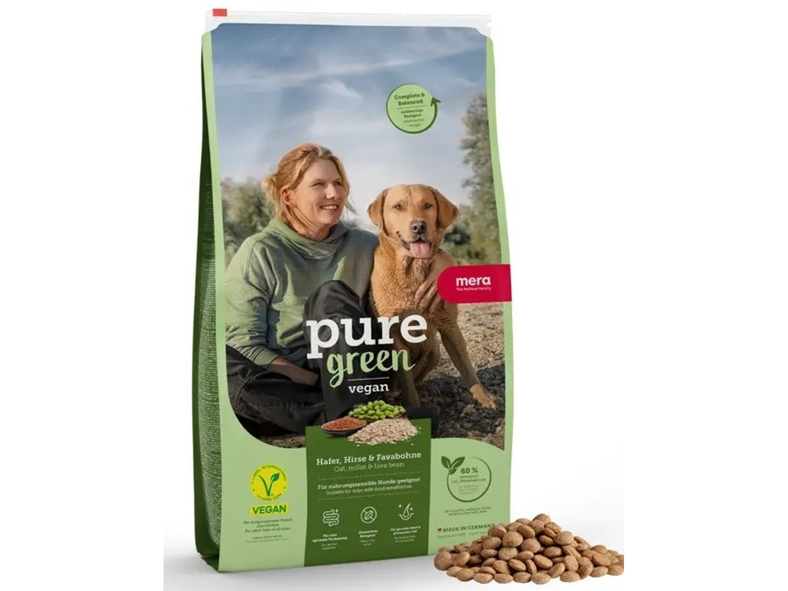 MERA Pure Green – 100 % vegansk fuldfoder til foderfølsomme hunde. Plantebaseret opskrift med havre, hirse og favabønner. Ideel til allergiske hunde og som bæredygtigt alternativ. Høj tolerance og uden animalske ingredienser. Giv besked, hvis du også ønsker den i en kortere version til fx kategori-visning.