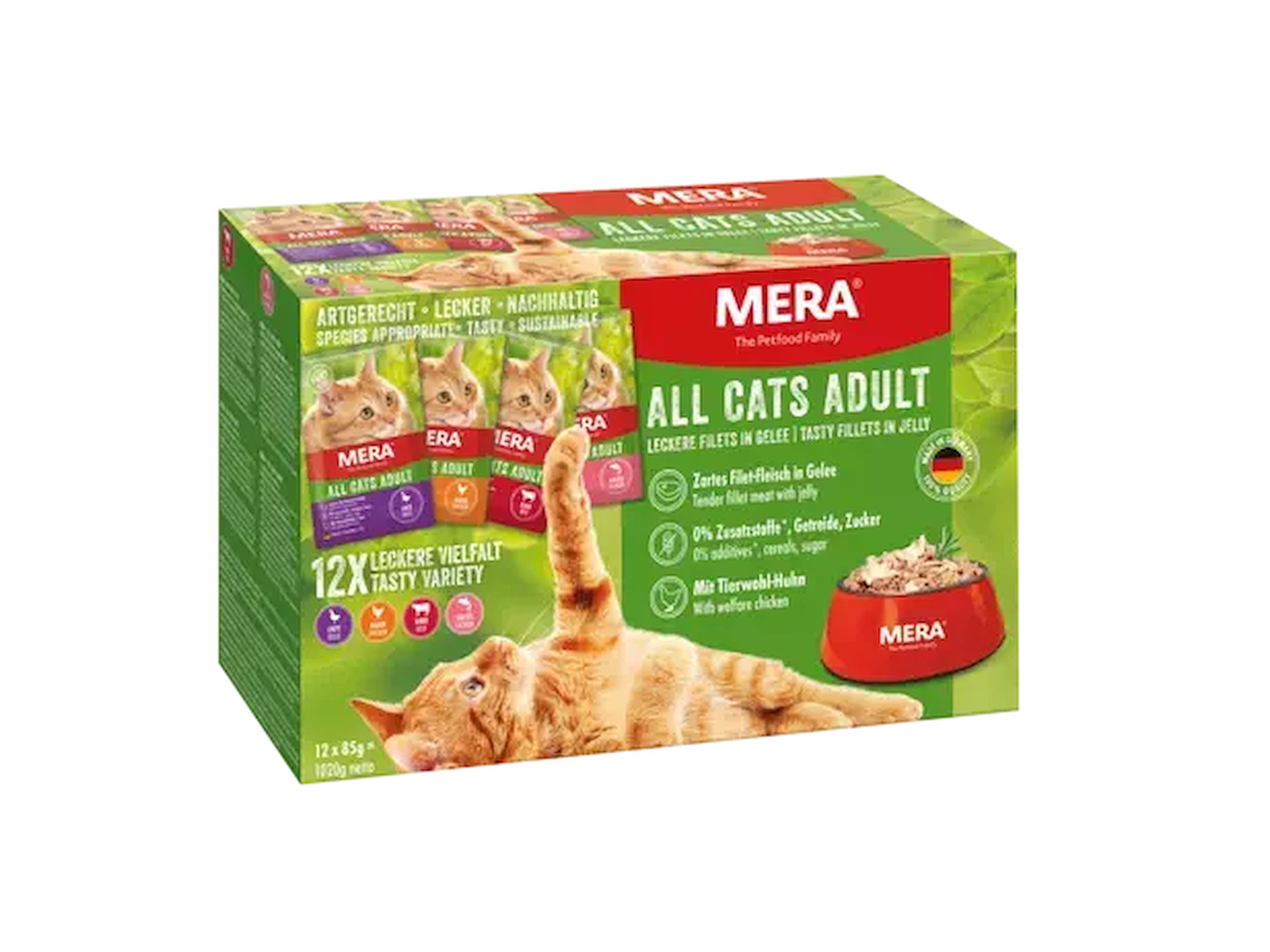 • MERA Cats Adult Mixpakke 12 x 85 g – kornfrit fuldfoder med mørt filetkød i gelé