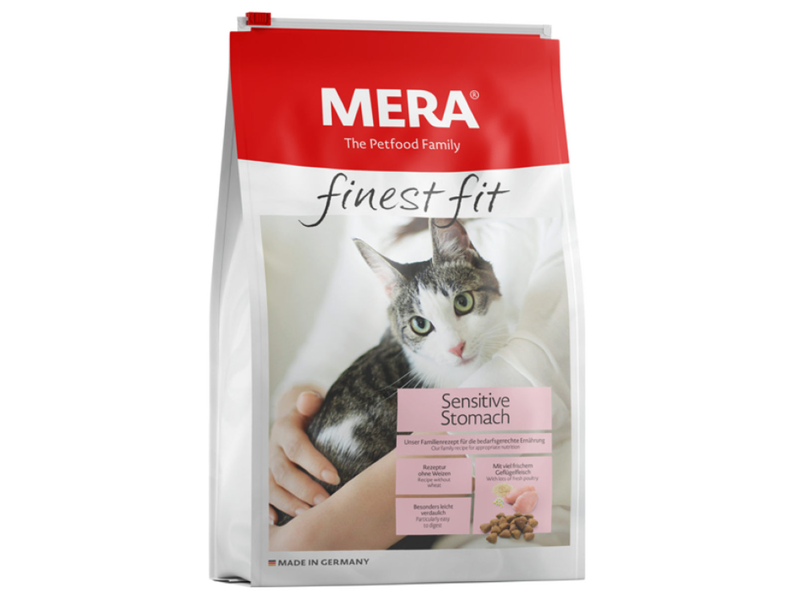 MERA finest fit Sensitive Stomach kattefoder er ideelt til katte med følsomme maver. Med letfordøjelige ingredienser som ris og kylling samt essentielle omega-fedtsyrer fra lakseolie, hørfrø og solsikkeolie, understøtter foderet en sund fordøjelse, skinnende pels og stærkt immunforsvar. Opskriften er kornfri og indeholder ingen kunstige tilsætningsstoffer, hvilket gør den særligt velegnet til ernæringssensitive katte.