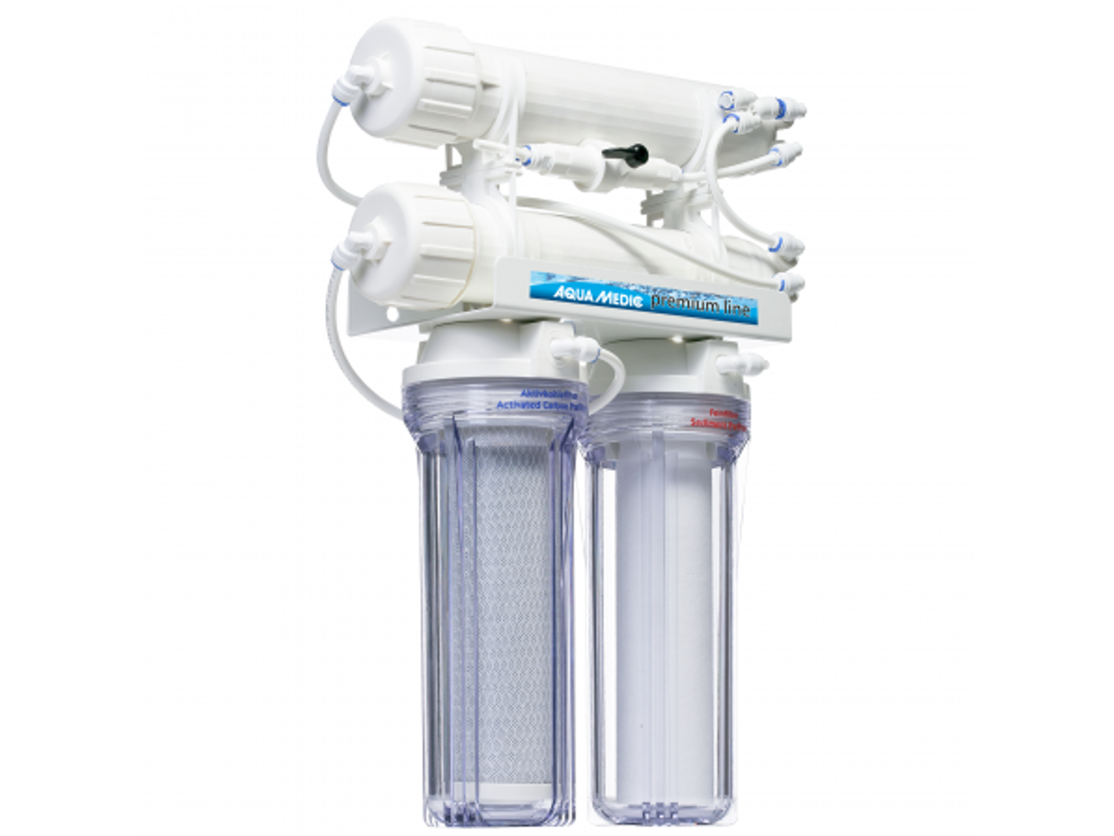 Premium line 600 omvendt osmose anlæg er en kompakt og et alsidigt produkt. Den har to store 25,4cm filterpatroner. Alle komponenter, forfilterhusene og membranmodulet er monteret på et stærkt pulverlakeret vægmonteringsbeslag. Et bundfaldsfilter bevarer alt partikler større end 5 µm og et kulfilter beskytter membranen ved at fjerne klor. Membranen, hjertet af enheden, er ansvarlig for vandkvaliteten. Aqua medic bruger den seneste generation af TFC (polyamid/polysulfon) membraner for at levere den højeste kvalitet behandlet vand. Der medfølger skylleventil og dermed kan anlæggene opnå et genvindingsforhold på ca 3-4:1 koncentrat:permeat, og en afvisningsgrad på op til 98%.