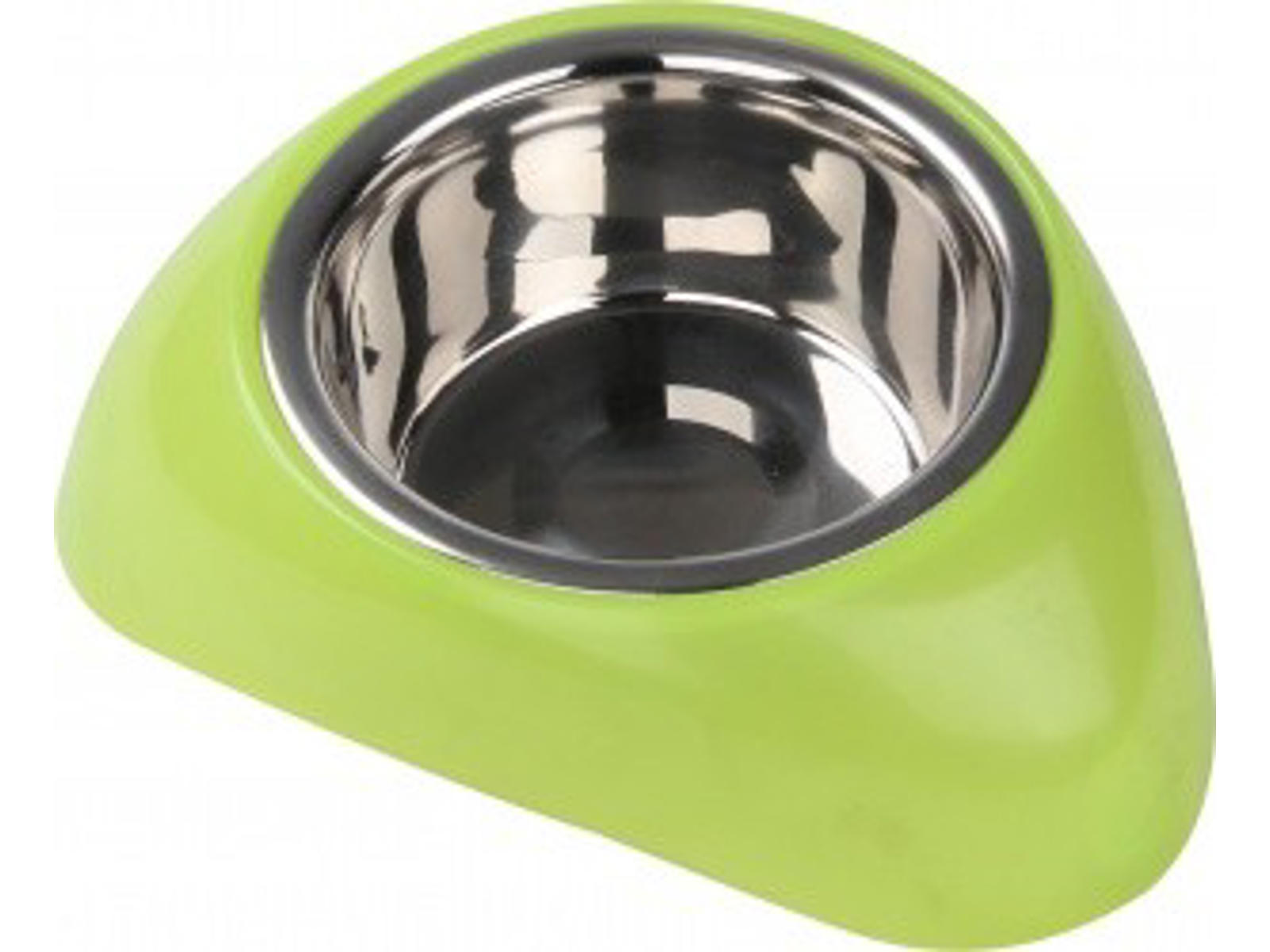 • Rustfri skål i plastikstativ, i farven grøn.