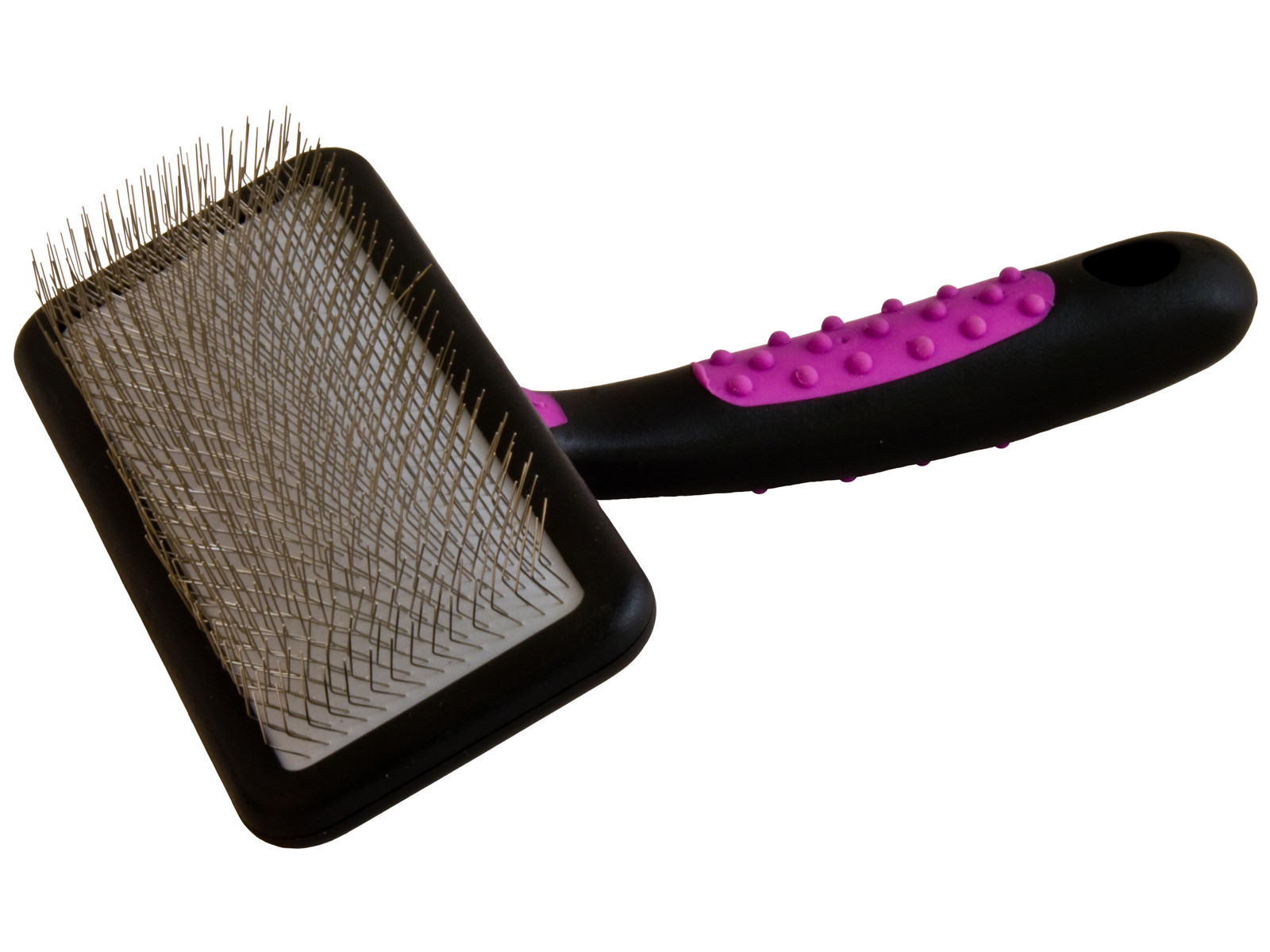 Det ergonomiske gummiskaft giver et behageligt greb, som gør den daglige pelspleje lettere og mere præcis, mens det robuste børstehoved i rustfrit stål sikrer lang holdbarhed. De bløde børstepigge glider skånsomt gennem pelsen og hjælper med at fjerne løse og døde hår uden at irritere huden. Samtidig forebygger den sammenfiltring og holder underulden sund og luftig.
