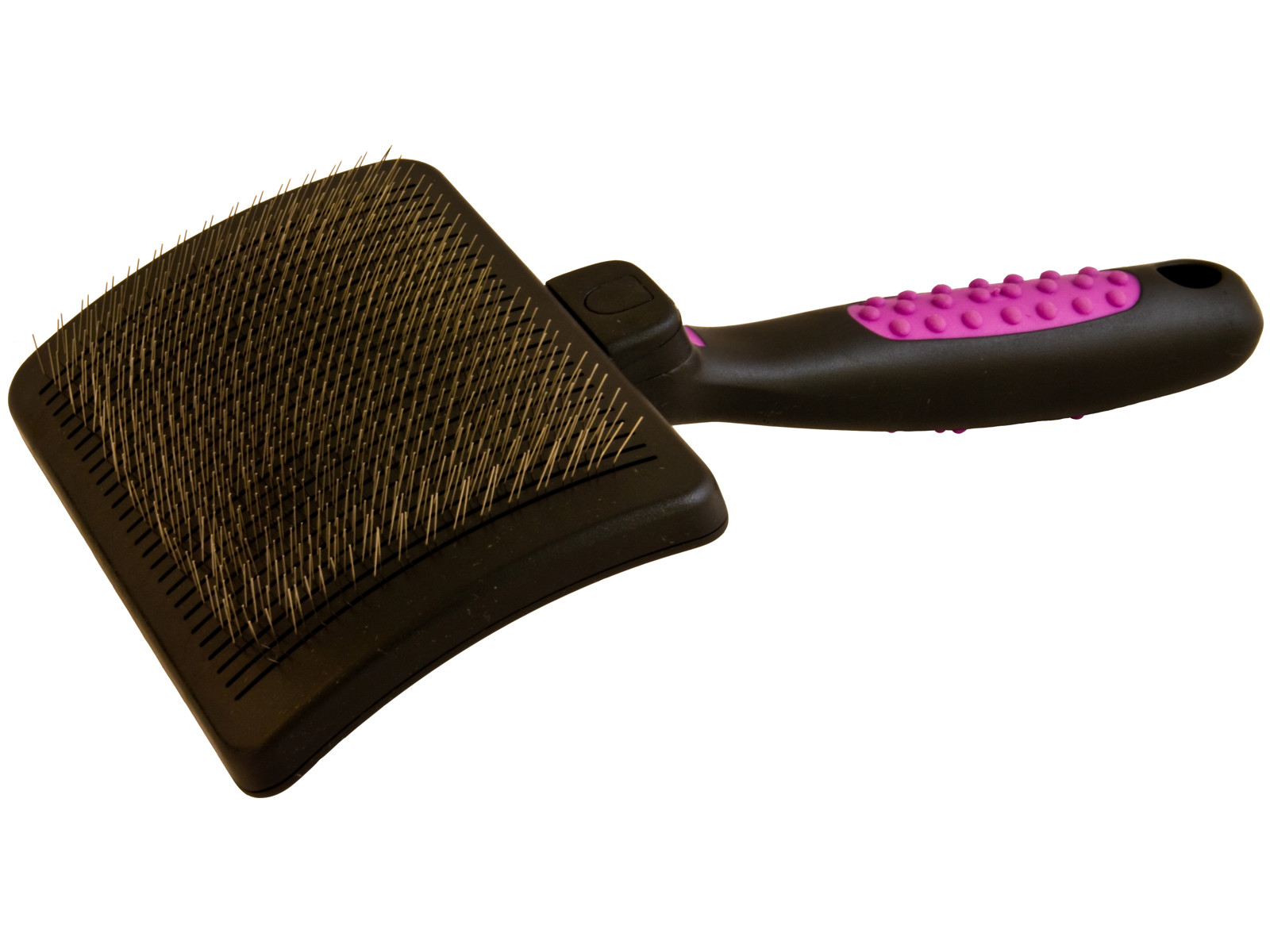 • Selvrensende karte som kan anvendes på store hunde med lang pels eller ruhår. Når puden er fuld af afredte hår, trykkes der på knappen, hvorefter hårene frigives fra puden.