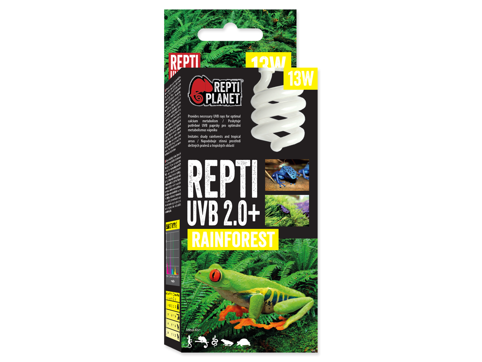 REPTI PLANET UVB 2.0+ udsender ikke nok varme og lysstråler. Hvis det er nødvendigt, kombineres med varme- og belysningslamper (såsom Repti Planet Infrarød Varme, Dagslys Basking Spot, Dagslys Frost, Dagslys Neodym, Far Infrarød Varme eller Natvarme). Den optimale UVB-intensitetsstråling hjælper med at omdanne vitamin D3, hvilket sikrer calciumabsorption. UVB-stråling er en del af sollys, hvilket er vigtigt for terrariumdyres sundhed og forhindrer metaboliske sygdomme. Intensiteten af UVB-stråling i pærer falder under brug (i løbet af 1 år mere end 50%). Regelmæssig udskiftning sikrer optimal UVB-intensitet. Når du vælger en pære, er det nødvendigt at tage ikke kun hensyn til typen af UVB-pære, men også de dyrearter, der skal opdrættes, og afstanden til dyret fra kilden til UVB-stråling. Lamper og lysstofrør er underlagt en normal garantiperiode. Det gælder dog ikke brud på lette fibre, rørbrud og gaslækage, som skyldes normal brug (standard levetid er ca. 6 måneder). Garantiperioden kan variere afhængigt af de enkelte stater og er underlagt lokale love og regler.