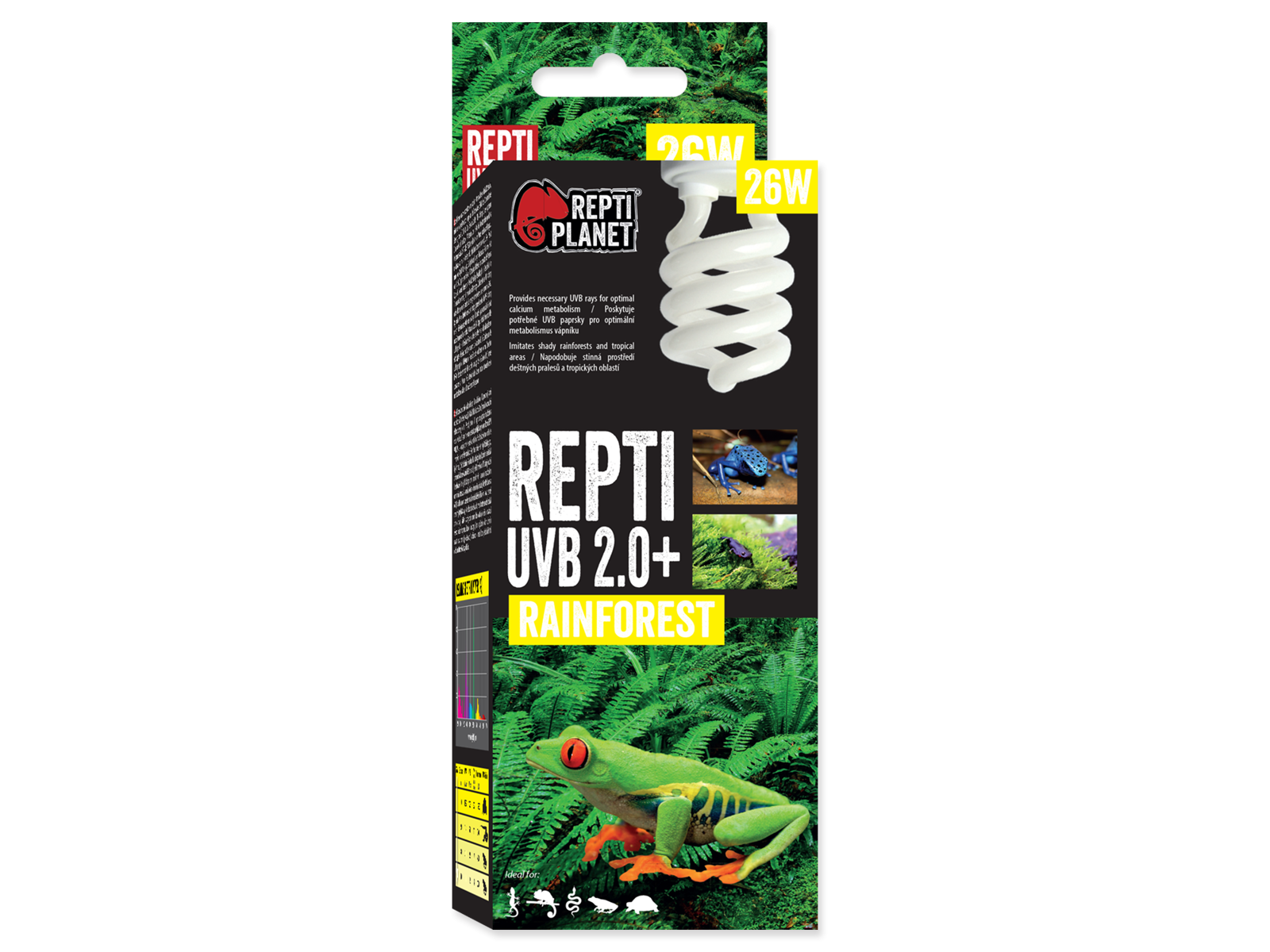 REPTI PLANET UVB 2.0+ udsender ikke nok varme og lysstråler. Hvis det er nødvendigt, kombineres med varme- og belysningslamper (såsom Repti Planet Infrarød Varme, Dagslys Basking Spot, Dagslys Frost, Dagslys Neodym, Far Infrarød Varme eller Natvarme). Den optimale UVB-intensitetsstråling hjælper med at omdanne vitamin D3, hvilket sikrer calciumabsorption. UVB-stråling er en del af sollys, hvilket er vigtigt for terrariumdyres sundhed og forhindrer metaboliske sygdomme. Intensiteten af ​​UVB-stråling i pærer falder under brug (i løbet af 1 år mere end 50%). Regelmæssig udskiftning sikrer optimal UVB-intensitet. Når du vælger en pære, er det nødvendigt at tage ikke kun hensyn til typen af ​​UVB-pære, men også de dyrearter, der skal opdrættes, og afstanden til dyret fra kilden til UVB-stråling. Lamper og lysstofrør er underlagt en normal garantiperiode. Det gælder dog ikke brud på lette fibre, rørbrud og gaslækage, som skyldes normal brug (standard levetid er ca. 6 måneder). Garantiperioden kan variere afhængigt af de enkelte stater og er underlagt lokale love og regler.