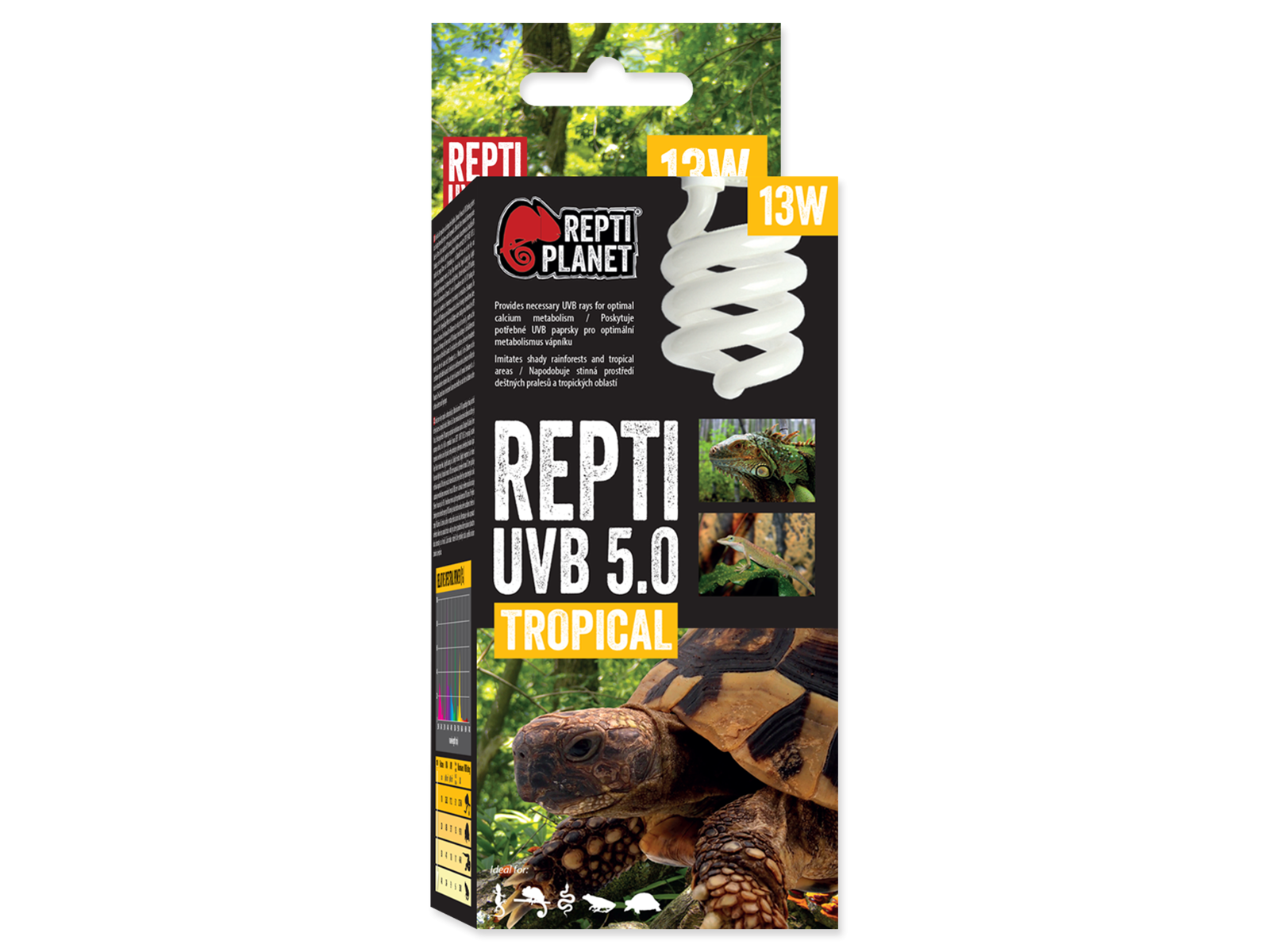 REPTI PLANET UVB 5.0 udsender ikke nok varme og lysstråler. Hvis det er nødvendigt, kombineres med varme- og belysningslamper (såsom Repti Planet Infrarød Varme, Dagslys Basking Spot, Dagslys Frost, Dagslys Neodym, Far Infrarød Varme eller Natvarme).