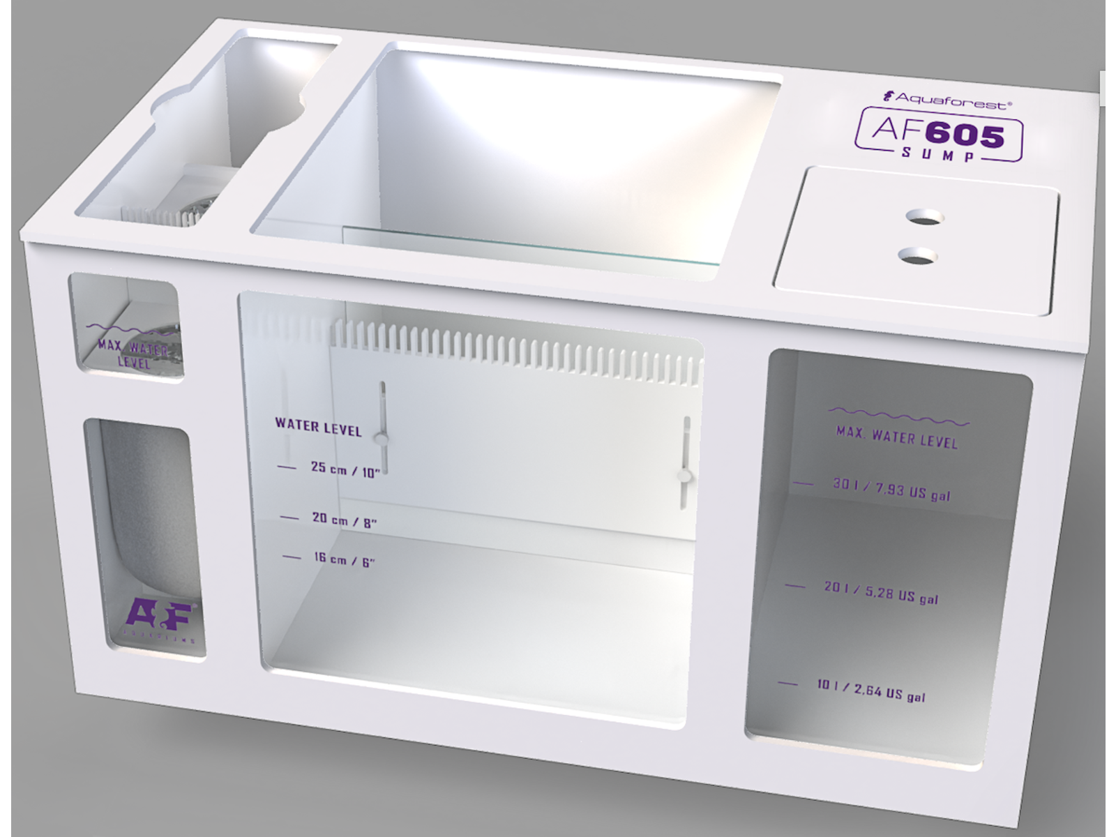 Meget holdbar PVC sump dedikeret selv til de mest krævende akvarier. Disse er designet af erfarne akvarister sump sikrer den mest effektive filtrering for at få koraller til at trives og vokse sundt. Kaskadekamre kombineret med kvalitetskamme giver perfekte betingelser for dynamisk, men stadig ultra støjsvag vandstrøm. Filtreringssokkerkammer gør det muligt at placere to sokker (inkluderet i sættet) med støjdæmpende hætter eller udskifte dem med mediereaktorer. Aquaforest sump er et resultat af erfaring og bedste designere og ingeniører tæt samarbejde med top akvarister. Dette smart designede system af skillevægge og bafler blev grundigt testet i årevis for at sikre, at det leverer det højeste filtreringspotentiale. Med tanke på, at et effektivt filtreringssystem er nøglen til en reefingssucces, blev hver detalje nøje overvejet og gennemtænkt. Vi stræber efter at levere den højeste kvalitet på alle stadier af reefing, så vi sørgede for, at vores kompleks af kamme og kamre giver optimal støjreduktion ved at udtone uønskede lyde. Præcis svejsning af elementer garanterer den højeste tæthed. Den mest pålidelige kombination af akvaristerfaring, avanceret teknologi og det fineste håndværk på markedet!