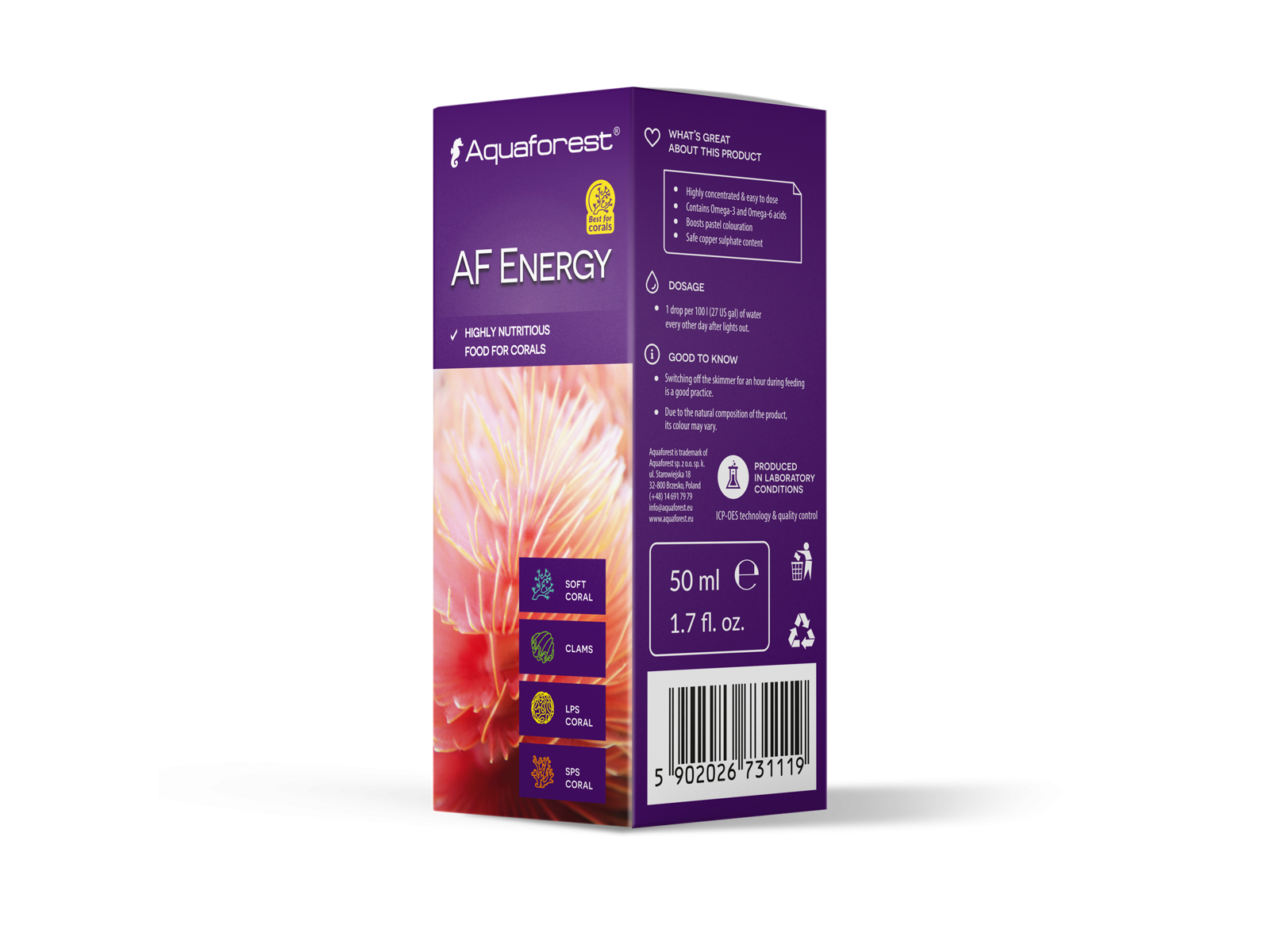 • Tilskud indeholdende et meget nærende koncentreret foder til alle typer koraller, især SPS-koraller. AF Energy er en unik sammensætning af de mest værdifulde, naturlige ekstrakter. Den indeholder umættede Omega-3 og Omega-6 fedtsyrer, vitaminer og aminosyrer. AF Energy indeholder et naturligt ekstrakt fra et særligt udvalgt zooplankton. Ved at begrænse væksten af ​​zooxanthellae øger det den lyse, pastelfarve af SPS-koraller. AF Energy er blevet beriget med et kobbersulfat, som er nødvendigt for korrekt udvikling og intens farvning af koraller. Indholdet af kobbersulfat i dette produkt er næsten upåviselig og helt sikkert for alle marine organismer. På grund af den sure reaktion af AF Energy anbefaler vi at bruge AF Build samme dag for at stabilisere pH-niveauerne.