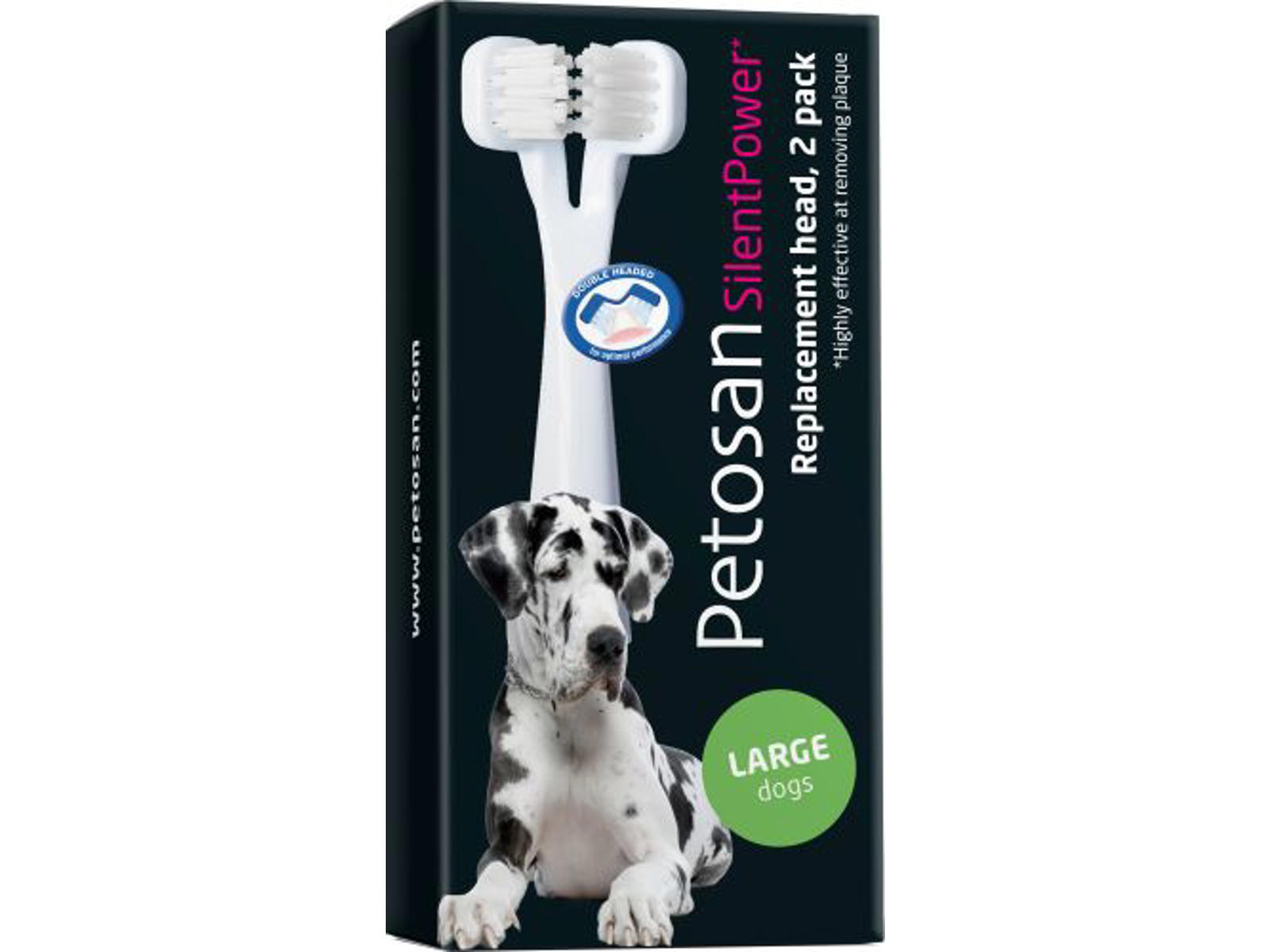 Du kan forhindre problemer med din hunds tænder ved at børste tænder med Petosan Børstehoved. Børstehovedet, som har to børster vinklet 45 grader, bruges til Petosan Silentpower El-Tandbørste og kan børste tændernes yder- og inderside samtidig. Pakken indeholder to børstehoveder, som passer til hunde over 16 kg.
