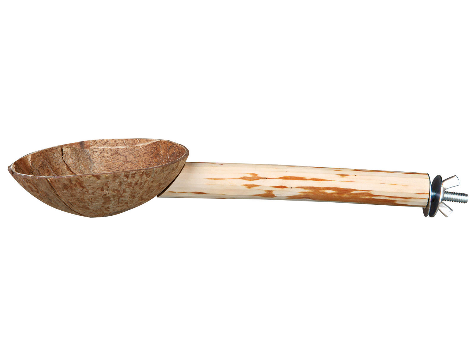 Trixie fuglefoder skål som er lavet af kokos og bambus. Forenden af foderskålens skaft sidder en skrue, således at den let kan monteres fast.