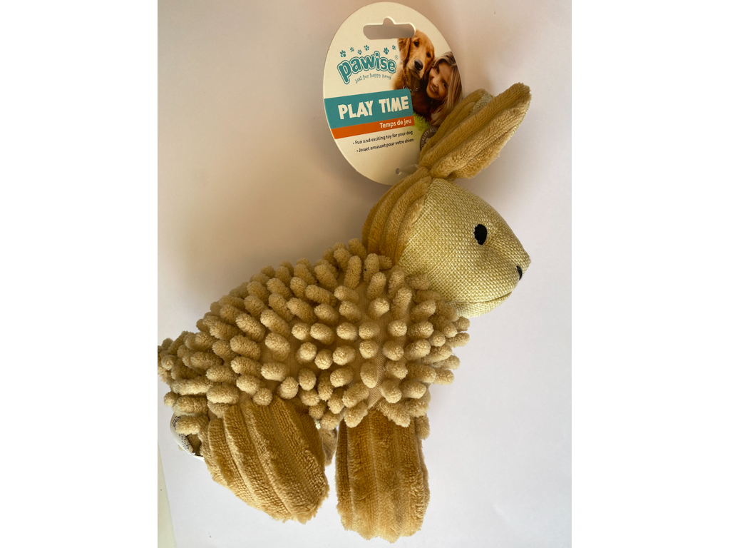 En bamse, som hundelegetøj, der er formet som en kanin, med små dutter i stof, som er til for at øge koncentrationen omkring bamsen for hundens side af.