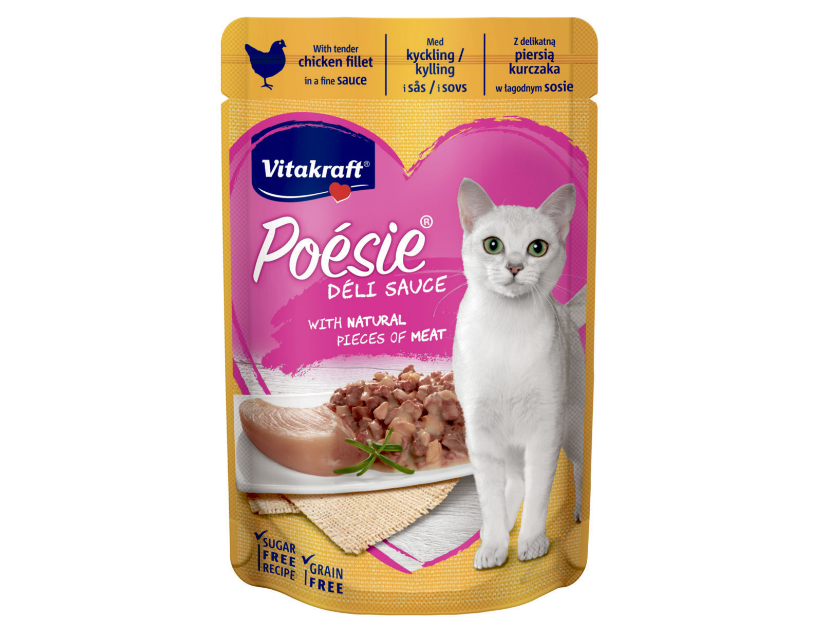 Vitakraft Poésie portionsposer kommer i flere smagsvarianter og er et lækkert vådfoder til den voksne kat. Denne variant består af fine fileter af kylling i delikat sovs, og er en uimodståelig lækkerbisken for langt de fleste katte. Foderet indeholder alle de vigtige og essentielle næringsstoffer, vitaminer og mineraler, som er med til at give din kat et dejligt katteliv. Bemærk at dette Poésie foder er kornfrit og derfor velegnet til katte som ikke trives med stivelsesholdige fyldstoffer som korn, majs, kartofler, hvede og ris i deres foder.
